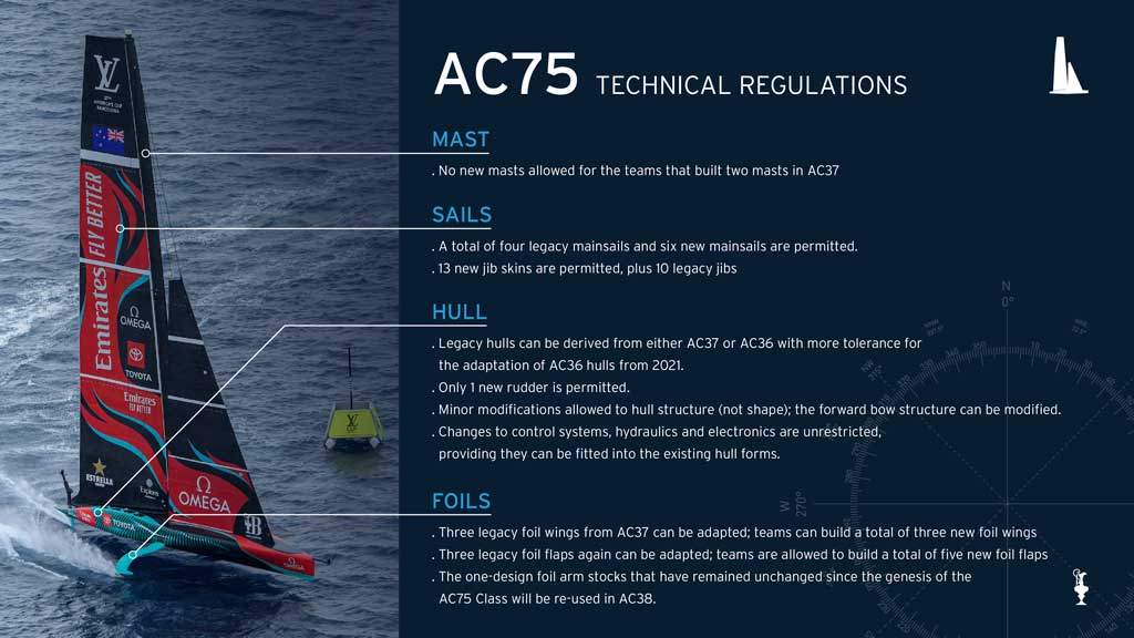 El Reglamento Técnico fija límites estrictos para equilibrar desarrollo y presupuesto. Solo se permitirá un timón nuevo por equipo, tres foils de nueva construcción y modificaciones de hasta un 20% en los elementos heredados. En cuanto a las velas, se autorizan hasta seis mayores nuevas y trece foques, siempre con la posibilidad de recorte para prolongar su vida útil.