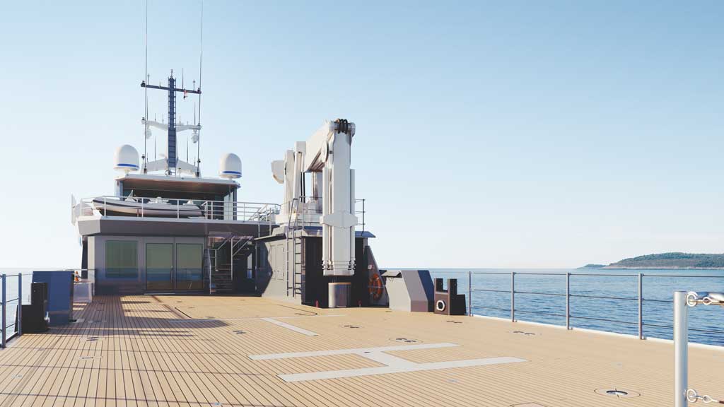 Con 53 metros de eslora, este Yacht Support cuenta con una amplia cubierta principal de popa abierta, equipada con una grúa de 15 toneladas capaz de manipular sumergibles, grandes embarcaciones auxiliares y otros equipos pesados.