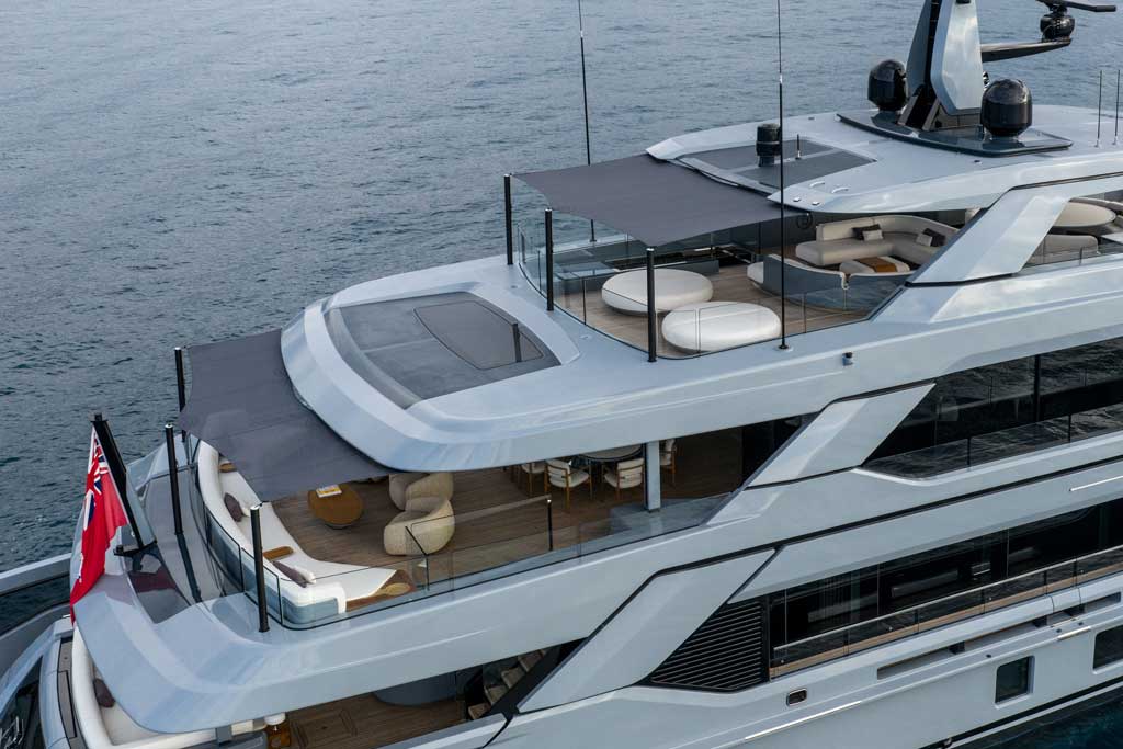 Su silueta combina geometrías definidas y pendientes fluidas, generando un juego visual que transmite movimiento incluso cuando el yate reposa en calma.