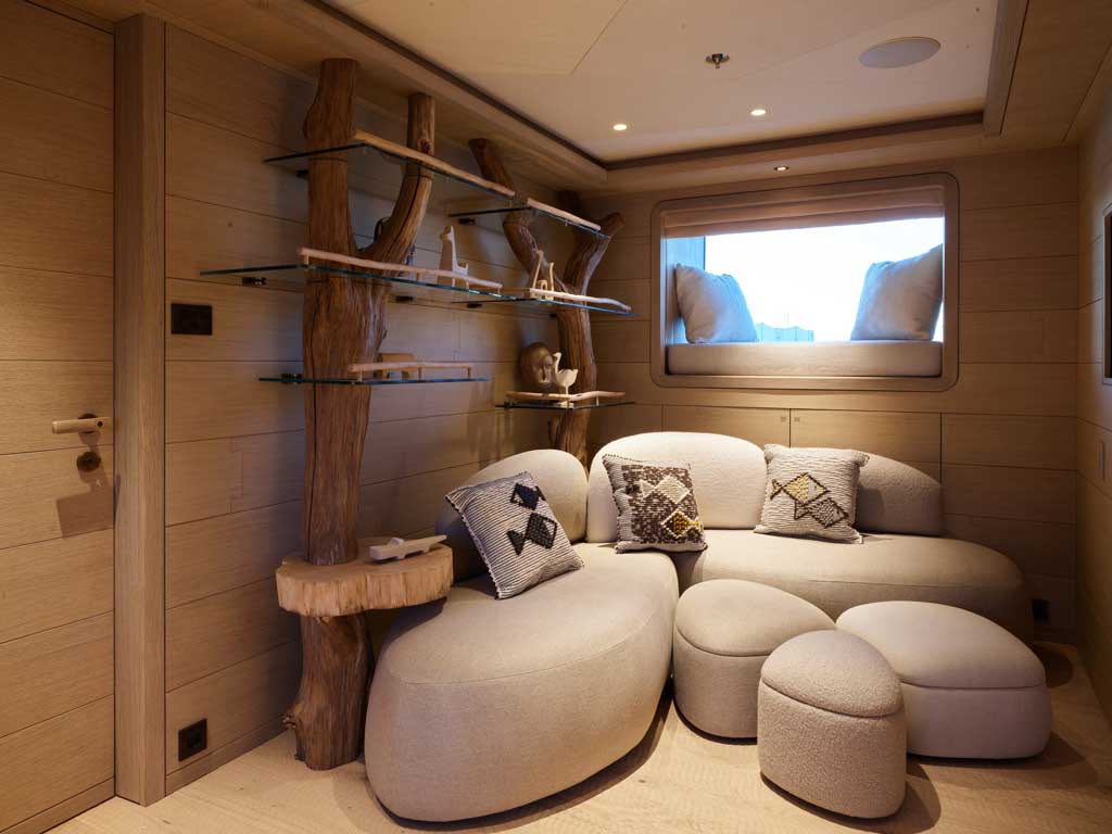 El diseño interior, guiado por la filosofía japonesa Wabi Sabi, celebra la belleza de lo orgánico y lo imperfecto. Tonos tierra, texturas naturales y superficies sin artificios dialogan con elementos vivos, como plantas naturales y materiales táctiles, para fortalecer la conexión con la naturaleza. La iluminación ambiental suave acompasa los ritmos circadianos, mientras que la sauna infrarroja junto al baño principal y la piscina de inmersión con agua helada en la cubierta de proa ofrecen un circuito de bienestar y recuperación física.