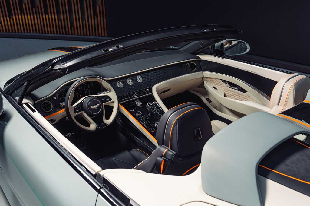 Si el exterior impresiona, el interior redefine el lujo personalizado. Mulliner ha creado una atmósfera en la que el conductor se sumerge en un entorno oscuro y deportivo, con acabados en cuero Beluga y Alcantara, costuras en Mandarin y un cinturón de piel naranja que rodea su espacio. En contraste, el pasajero disfruta de un entorno más claro y relajado, con cuero en tono Linen y detalles en Mandarin.