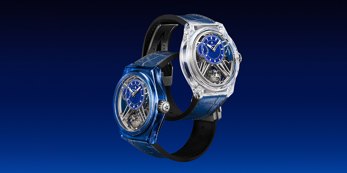 Como parte de las celebraciones de su 160 aniversario, Zenith presenta dos nuevas ediciones limitadas DEFY Zero G, con cajas de 46 mm elaboradas en zafiro azul y transparente. La carrura, el bisel y el fondo de la caja están tallados a partir de bloques de zafiro, un material casi tan duro y resistente a los arañazos como el diamante.