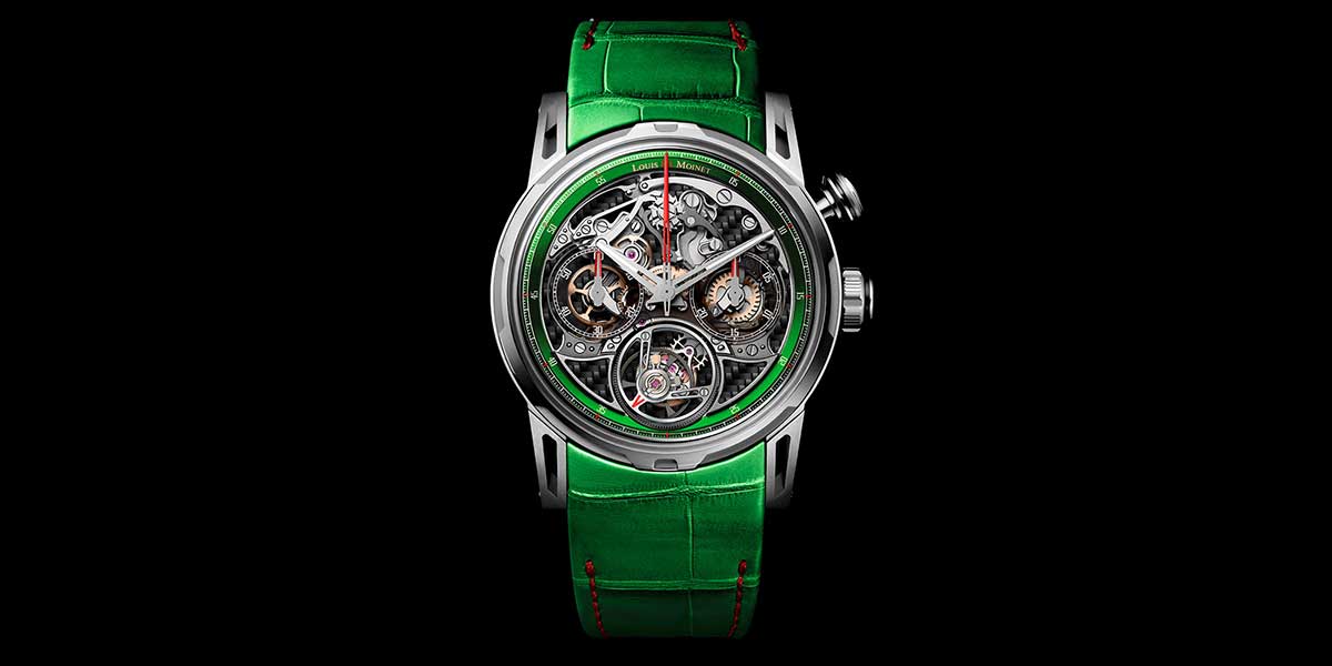 Creado por Les Ateliers Louis Moinet, exhibe un mecanismo a la vista que se combina con la magia de un tourbillon volante, adornado en verde y rojo. El verde predomina primero en el anillo de los capítulos, donde la minutería está puntuada en rojo cada cinco marcadores, y luego se extiende a la correa de piel de aligátor, realzada por un fino pespunte escarlata. Estos acentos rojos aparecen en todo el reloj como detalles: en el segundero del cronógrafo, en las manecillas de los contadores y en el indicador sobre la jaula del tourbillon.