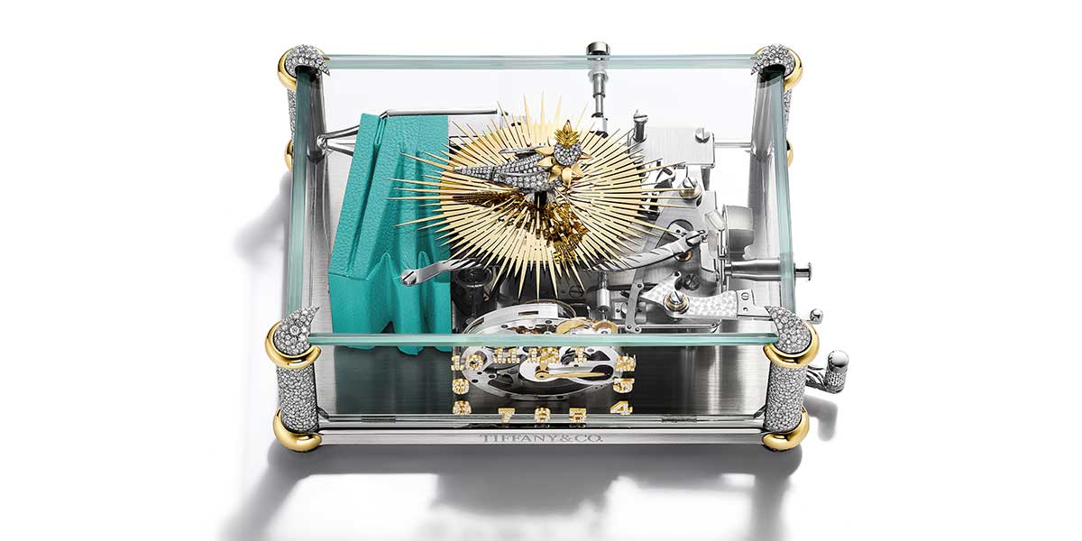 Dentro de la colección Time Objects: Singing Bird on a Clock de Tiffany & Co. se exhibe un reloj que rinde homenaje al icónico broche Bird on a Rock, creado en 1965 por Jean Schlumberger.