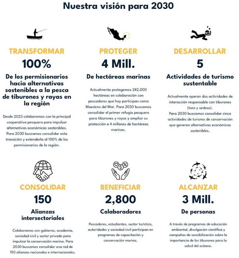 Mirando hacia el futuro, en la Fundación Saving Our Sharks trabajamos para ampliar nuestro impacto ecológico, económico y social. Nuestra visión hacia la Agenda 2030 es consolidar un modelo de conservación integral que promueva la protección de los tiburones, impulse economías locales sostenibles y fomente una cultura de respeto y cuidado por la vida marina.