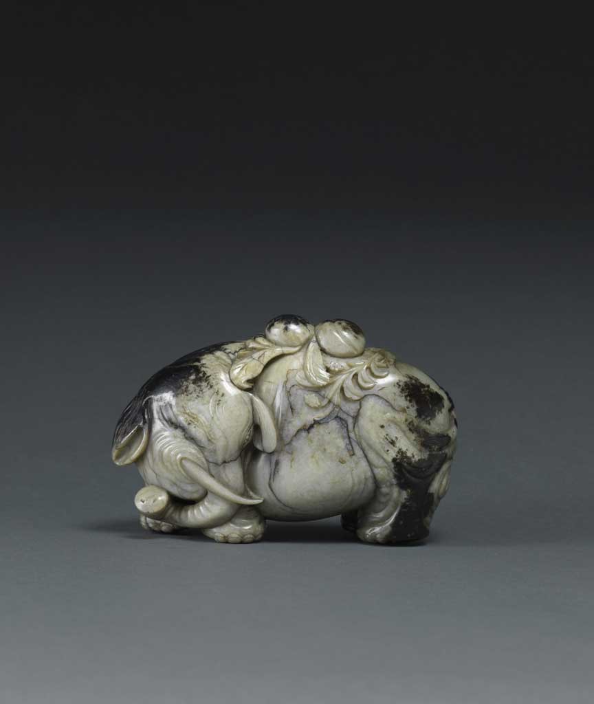 Mientras que el rollo horizontal de He Peng celebra el poder del intelecto, otras obras convirtieron al elefante en un vehículo para la imaginación global o la serena satisfacción personal. La talla de jade negro y gris del siglo XVII, que representa un elefante, está elegantemente estilizada, con proporciones suavizadas y abstractas para adaptarse a la mano y al escritorio del erudito.