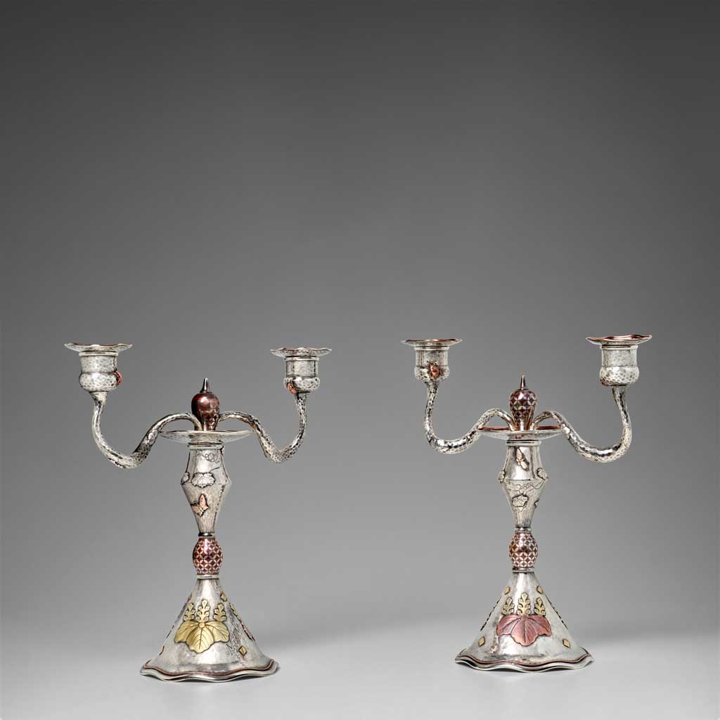 También se incluye una excepcional taza de doble asa con capullos de lúpulo dorados; un grillo de campana (suzumushi) de una intrincada factura en cobre patinado en rojo y negro; y, como pieza central del conjunto, un magnífico juego de candelabros compuesto por un par de candelabros de dos luces y candeleros a juego con el monograma "MJM" para la célebre coleccionista Mary Jane Morgan.