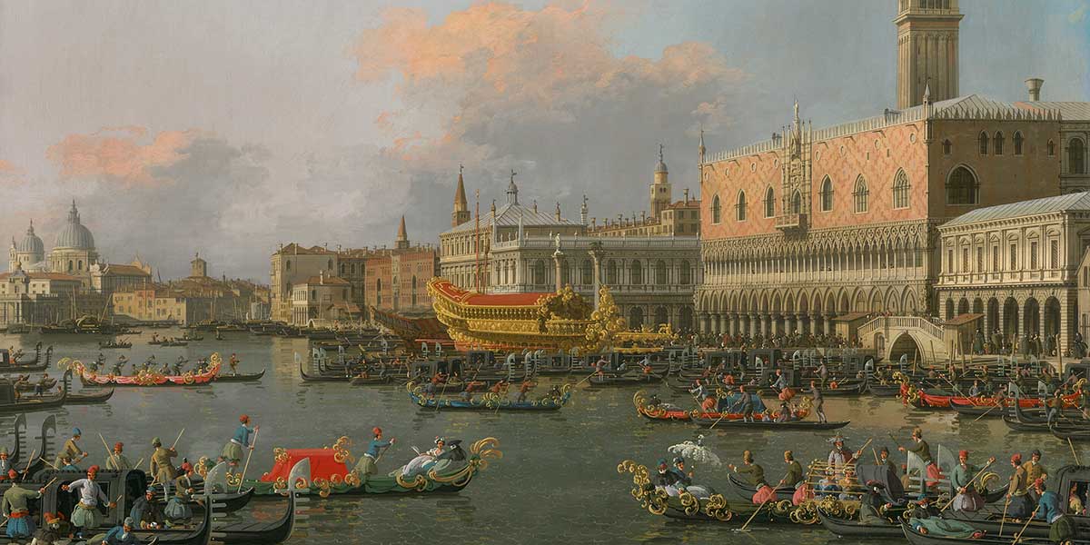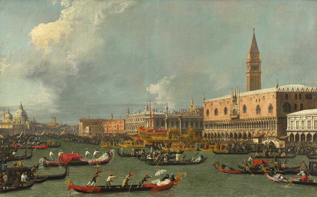 En el centro de la escena se encuentra el Bucintoro, con su resplandeciente techo rojo y su decoración dorada. Ya es de tarde, y el barco acaba de regresar al muelle tras su viaje anual al Adriático el Día de la Ascensión. Allí, el dux lanzaría un anillo al agua para marcar la unión simbólica entre Venecia y el mar.