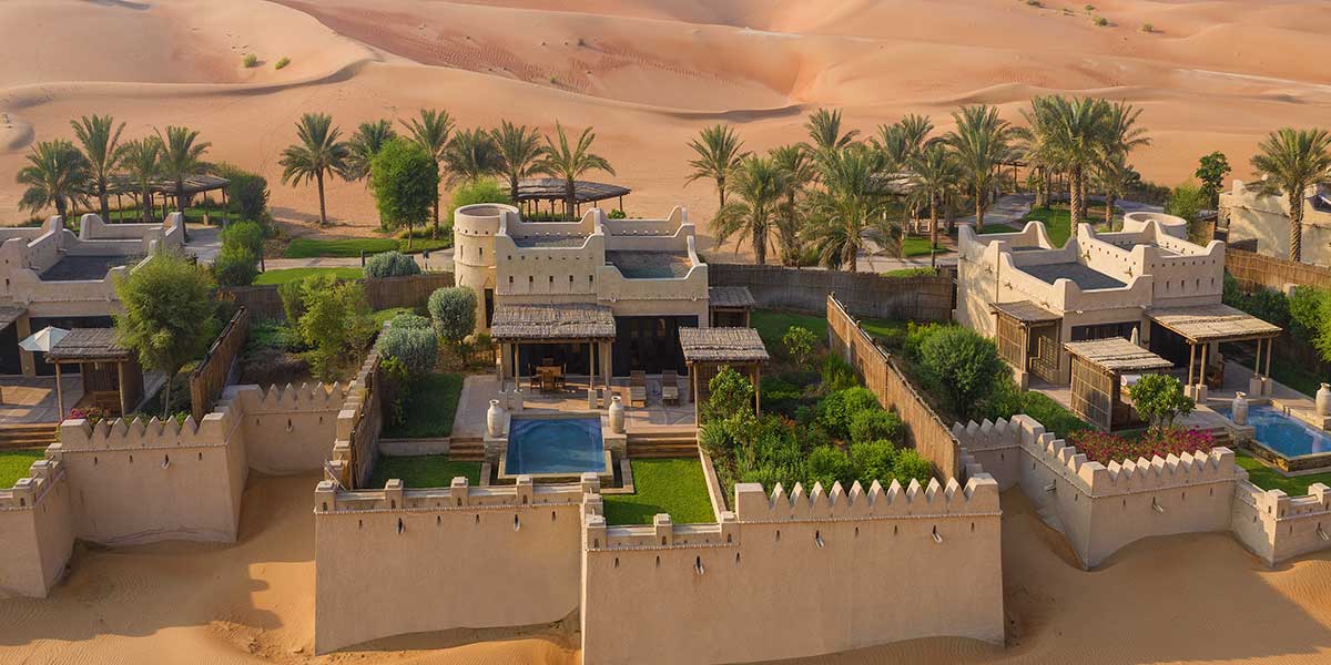 ▪ Qasr Al Sarab Desert Resort by Anantara, Emiratos Árabes Unidos [foto inicial]: una distinción clave. Situado en el desierto de Liwa, parte del Empty Quarter (la extensión de arena desnuda más grande del mundo), es un oasis a una hora y media de Abu Dabi.