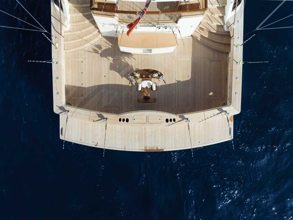 Its design also includes an articulated ladder that facilitates access to the water and can be converted into an alternative gangway to the dock. Thanks to its ability to navigate in reverse at 8 knots, the yacht allows efficient fishing even in extreme conditions.
