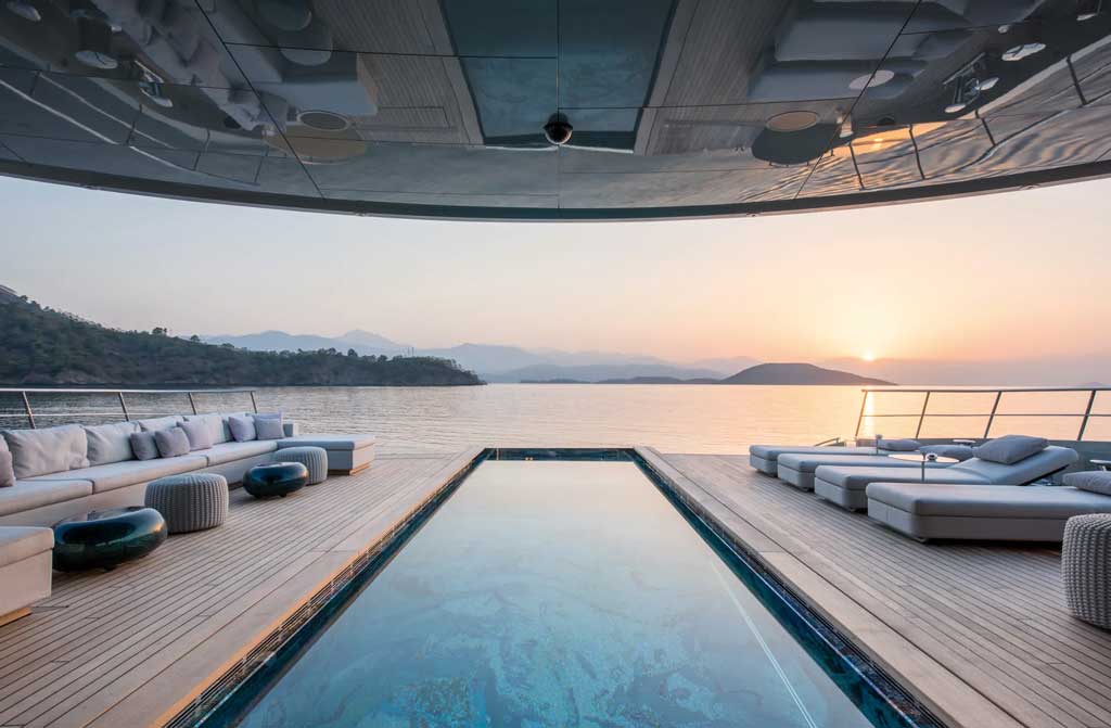 Silencioso al navegar en modo batería, su superestructura flotante y su exterior verde metalizado lo convierten en un elemento imprescindible. El superyate tiene capacidad para 12 pasajeros, en seis cabinas –incluido “el camarote” 10–.