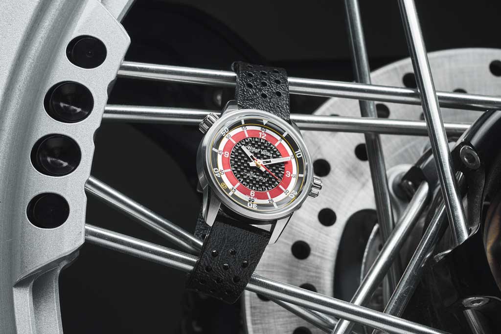 En el corazón de los nuevos relojes Wyler Vetta × MV Agusta se encuentra la esfera, diseñada como un homenaje directo al mundo de las carreras. En el centro, la fibra de carbono natural evoca el material predilecto para las motocicletas deportivas de alto rendimiento: ligero, resistente y símbolo de rendimiento extremo.