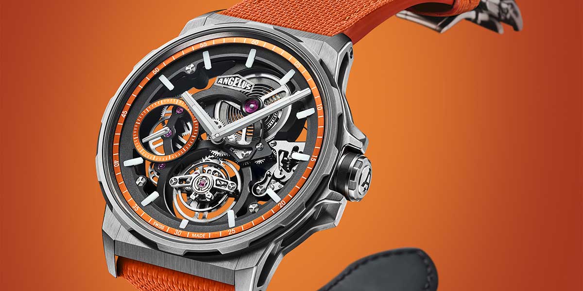 El deslumbrante tono naranja vibra en el Flying Tourbillon Skeleton Titanium, Orange Edition de Angelus.