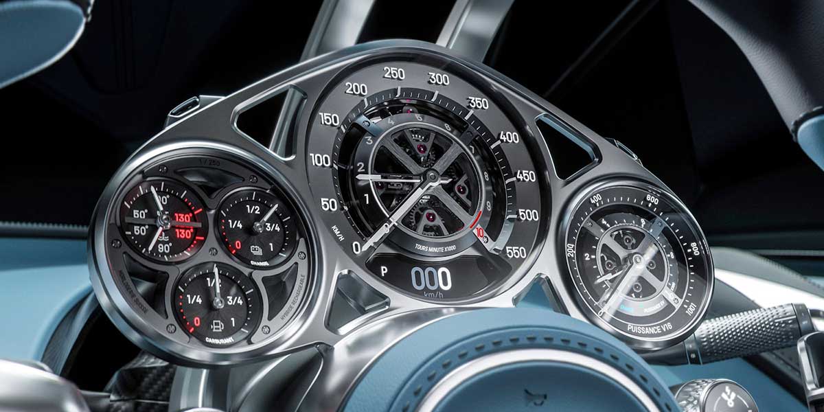 Con el mismo enfoque que el volante, las esferas resaltan la fascinación por la belleza de la mecánica: su caja de aluminio fresado, su elegante composición esqueletizada y su pantalla con cristal evocan la refinada simplicidad mecánica de los modelos Bugatti de principios del siglo XX.