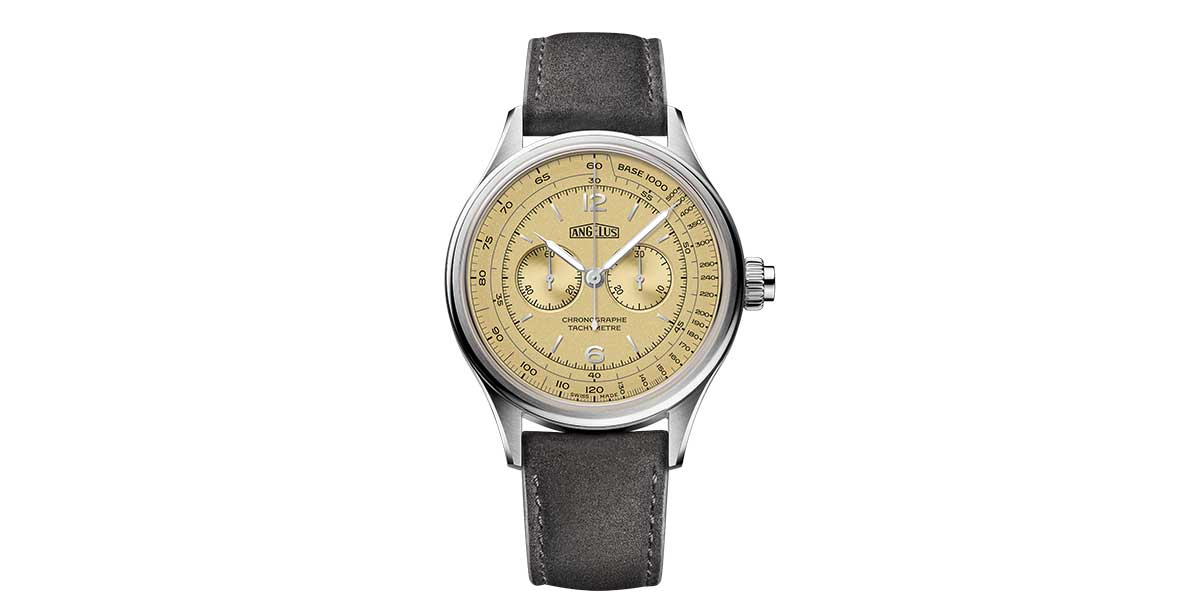 El conjunto se presenta en una caja de acero de 37 mm y apenas 9.25 mm de grosor, evocando los cronógrafos Angelus de los años cincuenta. El pulsador integrado en la corona reafirma su naturaleza monopulsador, mientras que la correa de nubuck gris y el estuche especial subrayan su vocación de pieza de colección.