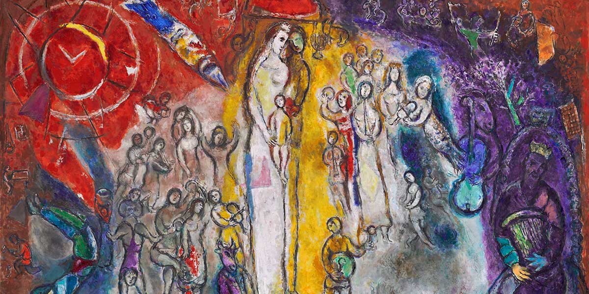 La rica paleta de Chagall se vio influenciada por su experiencia en la creación de vidrieras, muchas de las cuales fueron encargadas a lo largo de la década de 1960.