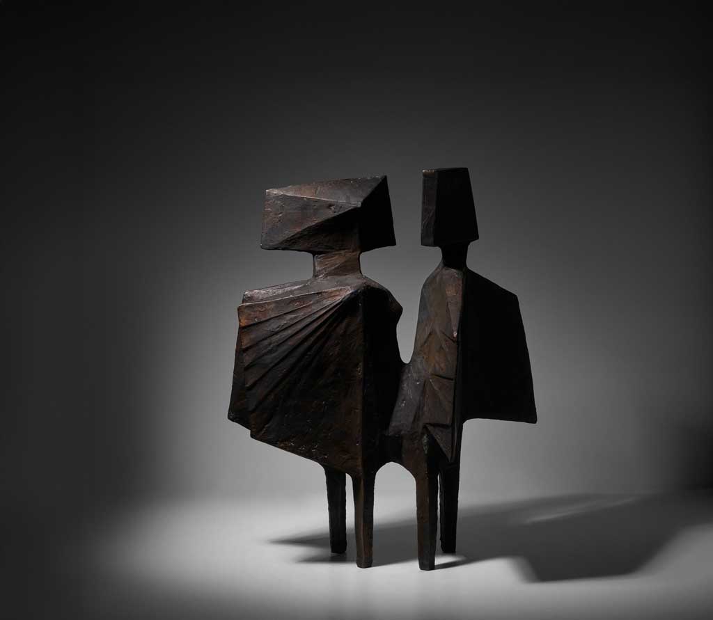 ▪ Lynn Chadwick, Conjunction XIV. Concebida en 1970, Conjunction XIV ejemplifica la continua exploración de Chadwick sobre la conexión humana y la tensión espacial a través de la forma escultórica. Forjada en bronce, sus planos nítidamente articulados y geometrías que se intersecan establecen un diálogo entre masa y vacío, encarnando la distancia psicológica y la comunicación silenciosa entre figuras, un motivo recurrente en toda la obra del artista.