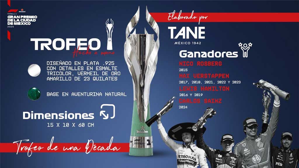 Para conmemorar la tradición de diez años de este diseño, TANE creó la pieza de colección: Trofeo Formula 1 Gran Premio de la Ciudad de México – Edición de Colección 10º Aniversario 2025, una obra a escala que rinde homenaje al origen del mítico trofeo, al recrear con absoluta fidelidad el diseño original del 2015 en plata .925 con detalles en esmalte tricolor, vermeil de oro amarillo de 23 quilates, y trayendo de vuelta su pedestal original de obsidiana.