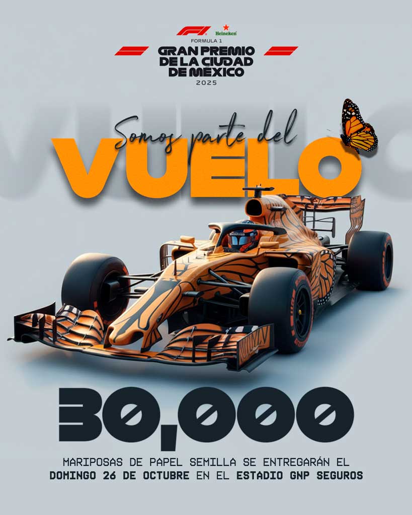 Destaca el Proyecto Mariposa Monarca, el domingo 26 de octubre. Durante el tradicional Desfile de Pilotos en el Autódromo Hermanos Rodríguez, el Estadio GNP Seguros se transformará en un escenario simbólico de esperanza. Treinta mil mariposas de papel semilla serán entregadas a los aficionados, quienes podrán hacerlas “volar “sobre la tribuna al sonido de los motores.