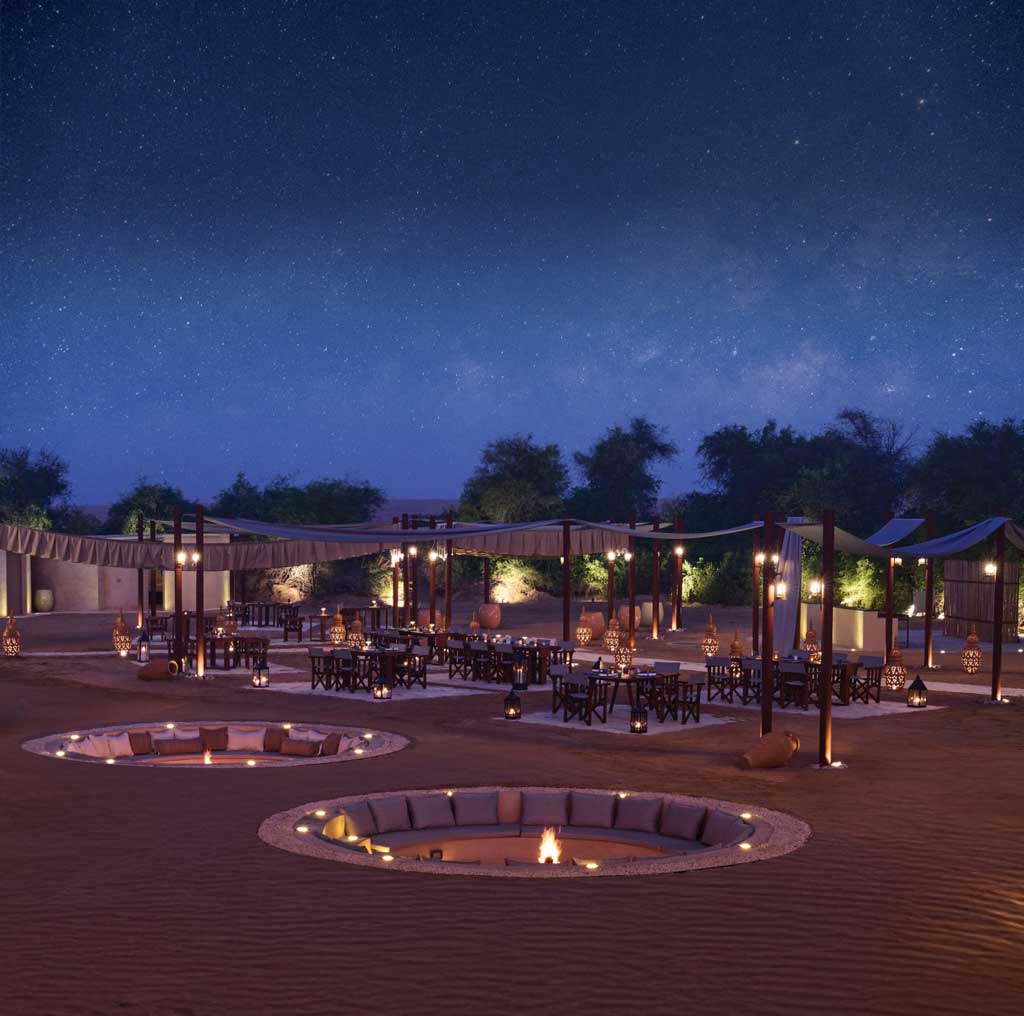 La cena se despliega bajo las estrellas y frente a un asador de inspiración beduina, organizada por Signature Events by JW Marriott Marquis Dubai, con mesas privadas, servicio personalizado y una sala lounge en desnivel, acompañado de fogatas.